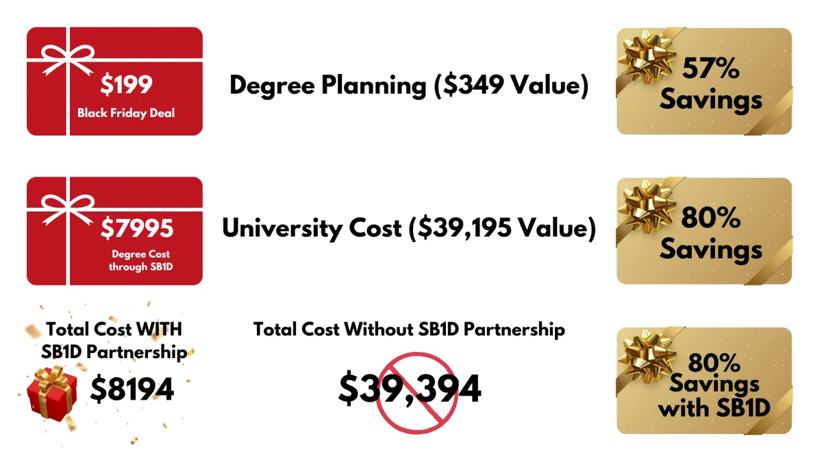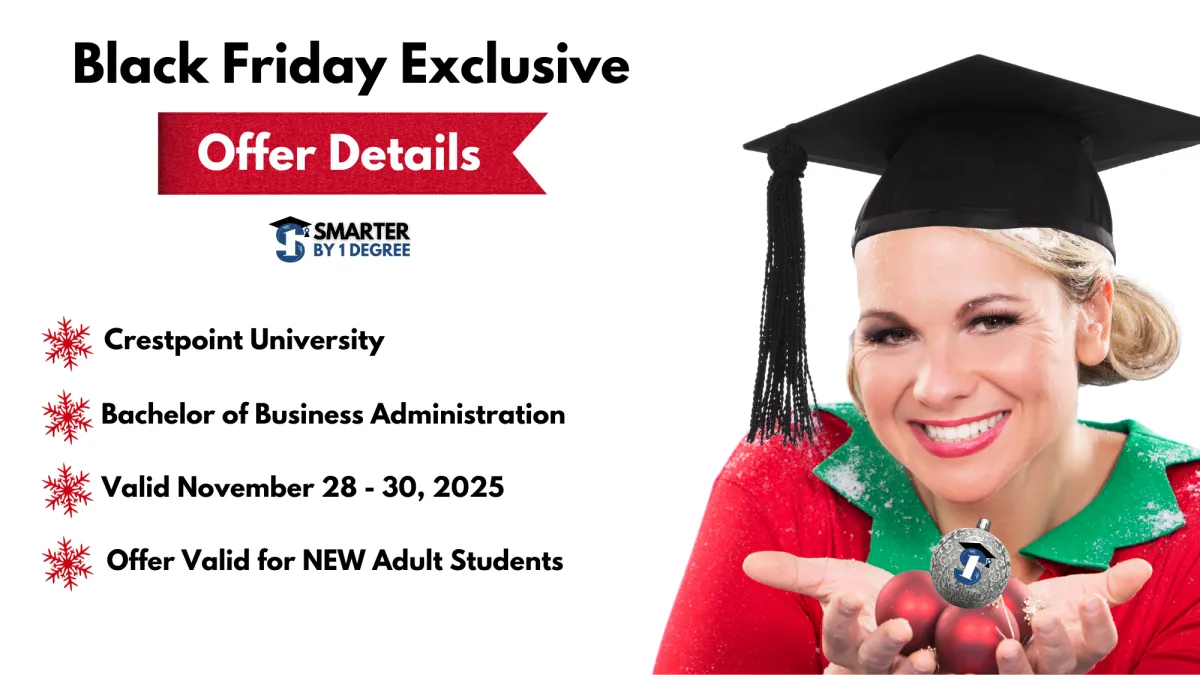 The Black Friday Degree Planning Special of $199 is available exclusively for new adult students enrolling in the Crestpoint Bachelor of Business Administration degree program. Regular price for the Adult Degree Planning Session is $349, limited to the first 25 new clients. This special offer includes meeting 1-on-1 with advisor to go over credit evaluation, strategy for success, schedule, roadmap, classes, etc. It also includes support each step of the way through graduation. It does not include the $7995 cost of the degree. This Smarter by 1 Degree partnership will save you 80% on the price of this degree. The $199 promotional price is valid only from November 28-30, 2025. Offer applies to eligible individuals and cannot be combined with any other discounts or promotions. Other exclusions may apply. Smarter by 1 Degree reserves the right to modify or cancel this promotion at any time.